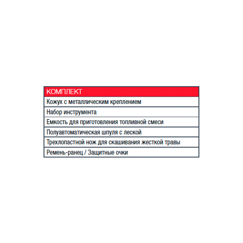 Кожух с металлическим креплением, Набор инструмента, Емкость для приготовления топливной смеси, Полуавтоматическая шпуля (облегченная заправка) с леской (посадка М10-1,25 мм), Трехлопастной стальной нож для скашивания жесткой травы, Ремень / Защитные очки |
